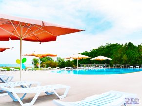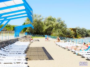 Пляж песчано-галечный собственная выделенная зона (верхний ярус), расположенная на расстоянии 50 метров от отеля, оборудованная кабинками для переодевания, навесами, шезлонгами.