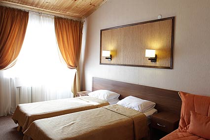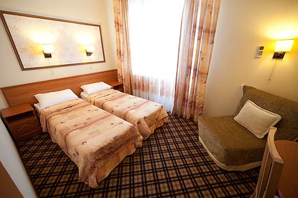 Однокомнатный номер с двумя односпальными кроватями. В номере: стол, стул, 2 прикроватные тумбочки, мягкое кресло-кровать, шкаф, багажница с зеркалом, фен, эл. чайник, чайная посуда, ЖК-телевизор, телефон, сейф, холодильник, сплит - система, сан. узел с душем/поддоном и теплым полом.