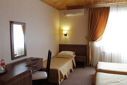 Однокомнатный номер с тремя односпальными кроватями. В номере: стол, стул, 3 прикроватные тумбочки, мягкое кресло-кровать, шкаф, багажница с зеркалом, фен, эл. чайник, чайная посуда, ЖК-телевизор, телефон, сейф, холодильник, сплит - система, сан. узел с ванной и теплым полом.