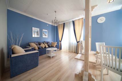 Двухкомнатный номер с двуспальной кроватью. В номере: журнальный столик, туалетный столик, стул, 2 прикроватные тумбочки, мягкий диван-кровать, кресло, шкаф, багажница с зеркалом, фен, эл. чайник, чайная посуда, 2 ЖК-телевизора (в гостиной и спальной комнате), телефон, сейф, холодильник, 2 сплит - системы, 4 номера с одним сан. узлом, ванной и теплым полом, 2 номера с двумя сан. узлами, душевой кабиной и теплым полом.