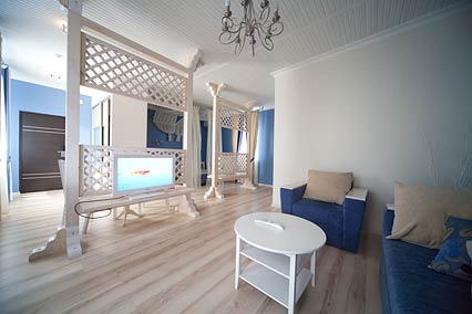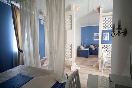 Однокомнатный номер с двуспальной кроватью, в романтическом стиле. В номере: журнальный столик, туалетный столик, 2 стула, прикроватные тумбочки, мягкий диван-кровать, кресло, шкаф-купе, зеркало, фен, эл. чайник, чайная посуда, 2 ЖК-телевизора (в гостиной и спальной зоне), телефон, сейф, холодильник, сплит - система, сан. узел с ванной и теплым полом, летняя мебель на балконе.