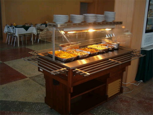 Современное оборудование: холодильные витрины для закусок и подогревающие мармиты для горячего, позволяют сохранять свежесть блюд и их вкусовые качества в течение всего времени приема пищи.