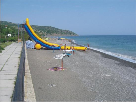 Пляж: в 100 м, песчано-галечный (протяженность 550 м), оборудованный (навесы, раздевалки, душ)