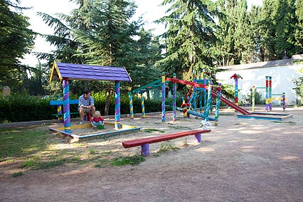 Пляж: собственный галечный (1200 м от пансионата). Доставка микроавтобусами на пляж (по графику) - бесплатно. Шезлонги – бесплатно