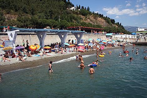 Пляж ТОК «Алушта» покрыт галькой и оборудован теневыми навесами, шезлонгами, раздевалками и душем. Его протяженность вдоль берега – 60 м. Расстояние от корпусов до пляжа отдыхающие преодолевают, спускаясь по удобной лестнице.