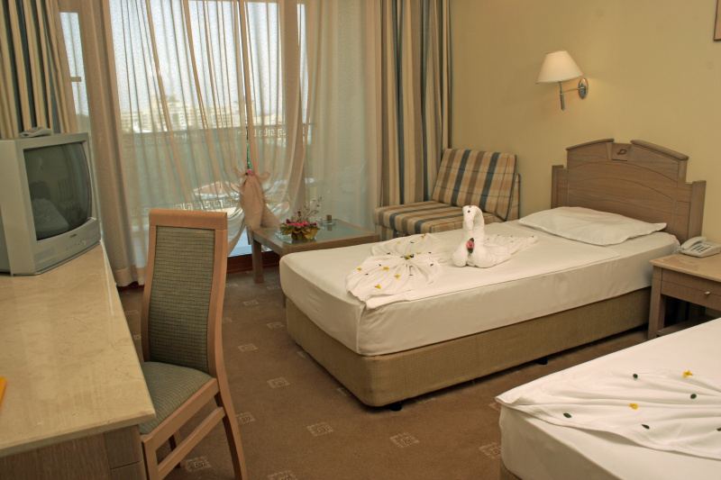 - 188 Dbl: вид на море/вид на парк, две отдельные кровати, кондиционер, TV SAT, телефон, мини-бар (доп. оплата), сейф (доп. оплата), балкон, ванна, фен, сушилка для белья, пол – ковролин.(25 кв.м.)