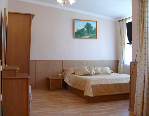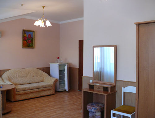 В номере: двуспальная кровать, журнальный столик, стулья, встроенный шкаф, вешалка для одежды, зеркало, халат, фирменные туалетные принадлежности, фен. Возможно 2 доп. места (раскладной диван, кроме номера для молодоженов). Максимальное размещение 4 чел. Панорамный вид на море, город, горы. Всего- 4 номера.