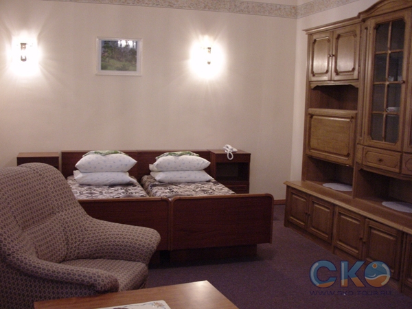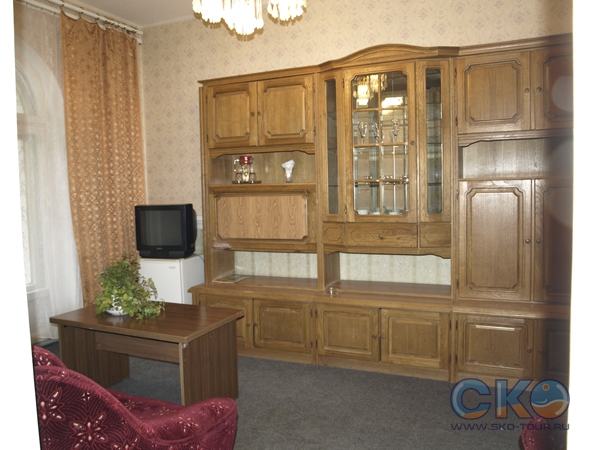 - Двухместный двухкомнатный номер "Люкс" (17-19 кв. м) удобствами (ванна или душ, умывальник, туалет, биде), мягка мебель, телевизор, холодильник, телефон. В номере произведен евроремонт. Дополнительное место (кресло-кровать).