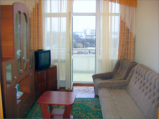 - 2-местный 2-комнатный люкс (9-этажный корпус)(37,5 м2) Номер с удобствами (туалет, умывальник, душ).В номере: два ТВ, холодильник, кондиционер, двуспальная кровать, набор мебели, балкон.