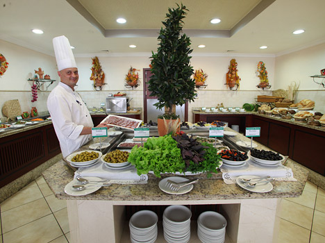 Гостям и отдыхающим предоставляется 3-х разовое питание по принципу шведского стола с большим выбором блюд. Предусмотрен также диетический стол. Для всех желающих посетителей работает уютный кафетерий, лобби-бар, бар у бассейна, а в лечебном центре работает фитобар.