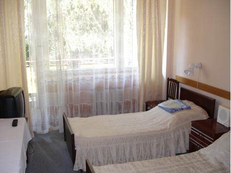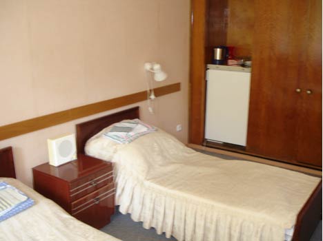 - «Стандарт Твин» - 2-хместный без балкона (Площадь номера 19 – 19,5кв.м. В номере две кровати, шкаф, две тумбочки, стол, два стула, холодильник, телевизор, фен, сейф. Балкон с двумя пластиковыми стульями и пластиковым столом.)