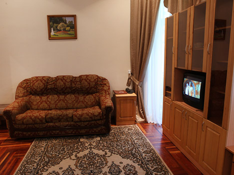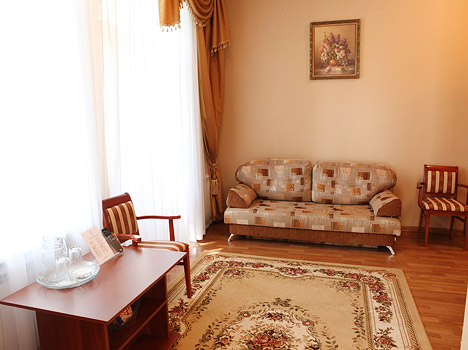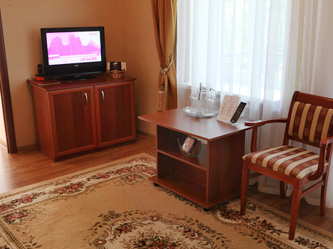 - одноместные «Люксы» средней площадью 17 кв.м: спальня, гостиная, ванная комната, холодильник, телевизор, телефон, кондиционер, мягкая мебель, набор посуды