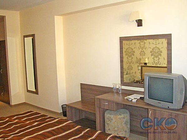 - Ap2pax (40 кв.м.) – спальня, гостиная (межкомнатная дверь), двуспальная кровать, доп. место - диван-кровать/раскладное кресло, кондиционер, TV SAT, телефон, мини-бар, сейф (доп. оплата), балкон, ванна, душ, фен, косметический набор в ванной, пол – ковролин.