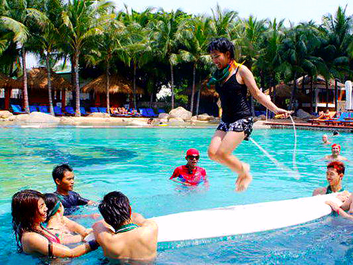 - открытый бассейн (2000 м2, с горками и песчаным пляжем)