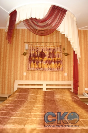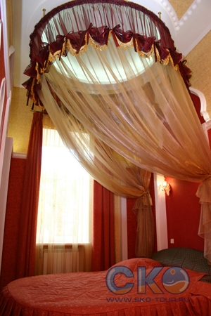 - "Императорский" номер для новобрачных Люкс однокомнатный 2-местный. Двуспальная кровать с ортопедическим матрасом, прикроватные тумбочки, письменный стол, стул, зеркальный шкаф-купе для одежды, ночные бра, настольная лампа, часы, зеркало на потолке, стильное постельное бельё, телевизор (спутниковое и эфирное ТВ), видеомагнитофон, муз. центр, кондиционер. Душевая кабина, удобный фирменный санфаянс, умывальник, гигиенический душ, фен