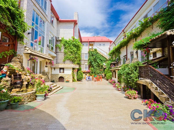 Пансионат Нива напоминает тихий уютный дворик в стиле древней Анапы, где можно отдохнуть в тени после летнего зноя среди цветочных клумб и экзотических фонтанов.
