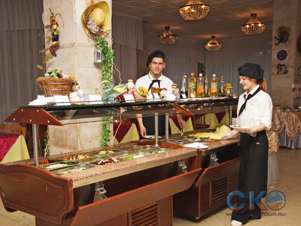 Питание в санатории ‒ 3-хразовое, по принципу «Шведского стола». Причем подаются, в том числе, и диетические блюда. Также на территории здравницы есть два бара и два кафе: «Пляж» и «14 этаж».