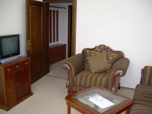 - Люкс 2-местный 2-комнатный 55 кв.м. В номере: гостиная с мягкой мебелью, двуспальная кровать (спальня) спутниковое ТВ, Wi-Fi, кондиционер (в каждой комнате), холодильник, фен, санузел с ванной, биде. Без балкона.