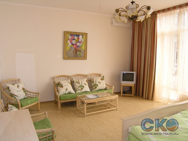 Люкс (2 номера): 2-комнатный номер состоит из: спальни с двуспальной кроватью, прикроватными тумбочками, телевизором, шкафом, и гостиной с раскладным мягким диваном, двумя креслами, журнальным столиком, телевизором, холодильником, кондиционером, электрическим чайником, чайным набором. Санузел совмещенный (массажная душевая кабина, туалет, биде, умывальник, сушка, фен). Есть выход в свой дворик. Расположен на 1-м этаже. Возможно размещение до 5-ти человек. Площадь номера 37 м.кв.