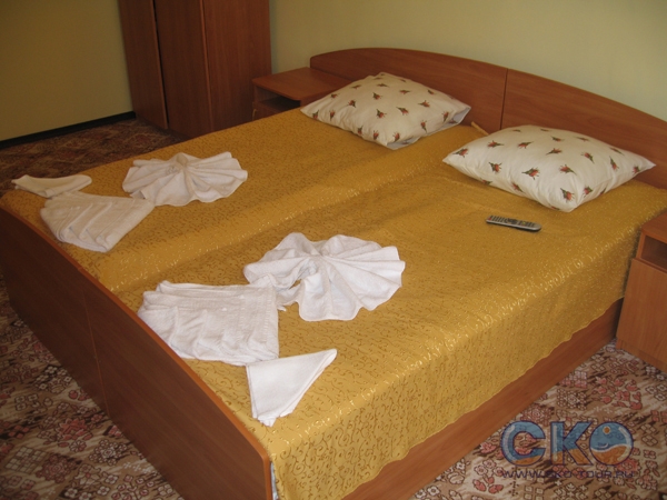 - 2-местный 2-комнатный «полулюкс»(40 - 50 кв.м). В номере: совмещенный санузел с ванной/душем. 2 кровати, 2 прикроватные тумбочки, трюмо с зеркалом, пуфик, мягкий уголок, шкаф. Вешалка, журнальный столик, ТВ, холодильник, кондиционер, вид на море