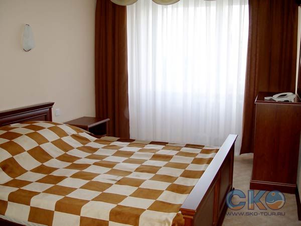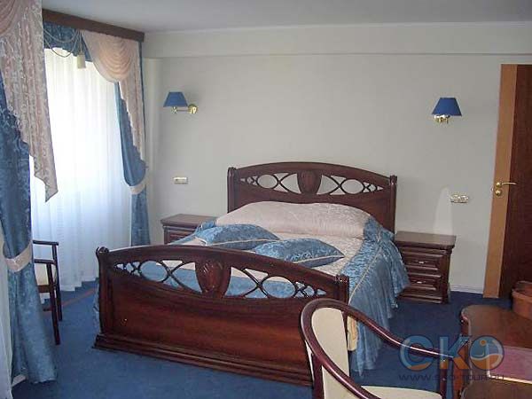 Люкс: В спальне семейная кровать с прикроватными тумбочками, туалетный столик, шкаф для одежды и багажа, телевизор, телефон, кондиционер. Ковровое покрытие. Санузел с джакузи, биде, фен.