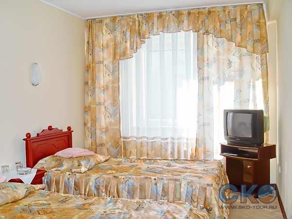 Комната: двуспальная кровать или две раздельные кровати, встроенный шкаф, тумбочки, телевизор, телефон. Ковровое покрытие.