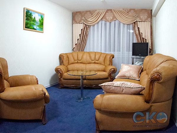 В номере: широкая кровать, шкаф, вешалка, полка для багажа и обуви, мини-бар (за отдельную плату), телевизор, беспроводной телефон, релаксационный уголок, сертификат на бесплатное посещение салона красоты «Магия».