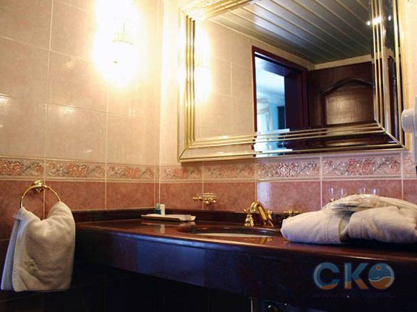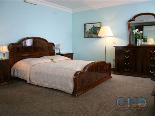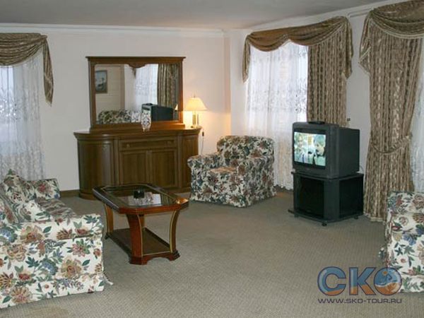 Просторный двухкомнатный номер (94м.кв.) с широкой кроватью в спальне и мягкой мебелью в гостиной. В номере: два санузла (угловая ванна), балкон, холодильник (минибар), спутниковое телевидение (14 каналов), международная и междугородняя связь, беспроводной доступ в Интернет.