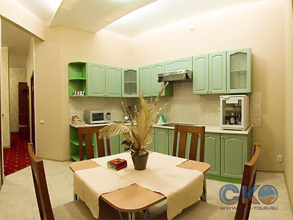 Кухня: кухонный гарнитур, посуда, СВЧ-печь, холодильник, телевизор, телефон. - Люкс Золотой 2-комн. 2-местный