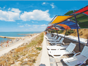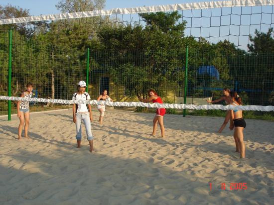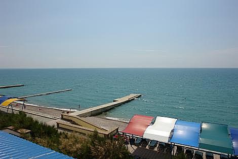 в 10-150 м от корпусов, мелко-галечный, серпантинная горка, теневые зоны с пластиковыми лежаками, пляжный волейбол, раздевалки, душ, туалет, бары; возможен прокат различных плавсредств