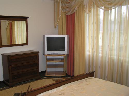 - 2-х местный номер «полулюкс» (общая площадь номера - 33 кв.м:, комната - 17 кв.м) с мини-кухней: 2 деревянные кровати, 2 тумбочки, ковер, шкаф, журнальный столик, 2 кресла, спутниковое ТВ, холодильник, кондиционер; на полу – ковровое покрытие, на стенах – обои. Мини-кухня (7 кв.м): полки для посуды, набор посуды, стулья, столик, холодильник, эл. чайник. Прихожая: шкаф, настенная вешалка, зеркало. Санузел – совмещенный (3 кв.м)