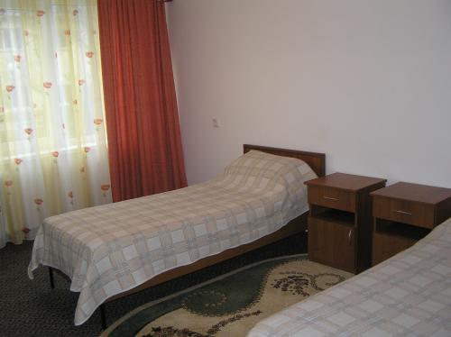 - 2-х местный номер стандарт (Общая площадь номера -25 кв.м, комната - 21,5 кв.м): 2 деревянные кровати, 2 тумбочки, стол, стулья, шкаф, настенная вешалка, зеркало, телевизор (спутниковое ТВ), холодильник, КД, эл. чайник, набор посуды. На полу – ковровое покрытие, на стенах – обои. Санузел – совмещенный (3,5 кв.м )