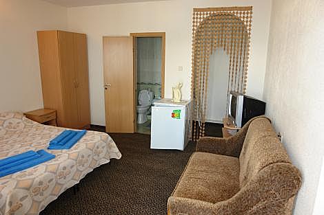 - 2-местный номер без балкона (общая площадь номера 18,6 кв. м, комната 10 кв.м, прихожая 4 кв.м): 2 кровати, 2 тумбочки, шкаф, столик, стулья, холодильник, ТВ, КД. Санузел - совмещенный. Открытая веранда (на 4 номера)