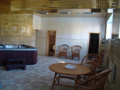- 2-х местный номер «люкс» (общая площадь номера - 52 кв.м) с мини-кухней: спальня (18,4 кв.м): 2-спальная кровать, 2 тумбочки, платяной шкаф, тумба, спутниковое ТВ, ковер, картины; гостиная (17 кв.м): журнальный столик, 2 кресла, диван, кондиционер, ковер; мини-кухня (7 кв.м) : шкафы для посуды, набор посуды, стол, стулья, холодильник, эл. чайник, ковер. На полу – ковровое покрытие, на стенах – обои. Санузел – совмещенный (3 кв.м); прихожая: шкаф, настенная вешалка, зеркало