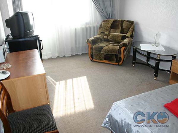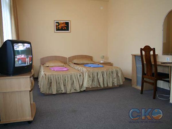Комната: две односпальные кровати, кресло, тубмочки, шкаф-купе, телефон, телевизор, холодильник, мини-бар, набор посуды, эл. чайник.