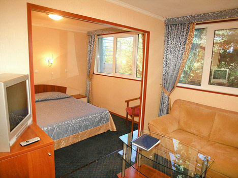 Гости пансионата размещаются в номерах четырех различных категорий комфортности, которые различаются площадью, удобствами, мебелью и отделкой. Однако, какой номер Вы бы не предпочли, Вам всегда будут доступны санузел с душевой кабиной, телевизор, холодильник и кондицинер - эти удобства присутствуют во всех номерах, вне зависимости от категории.