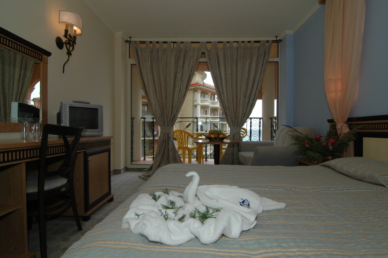 - Ap2pax (40 кв.м.) – спальня, гостиная с мягкой мебелью (межкомнатная дверь), двуспальная кровать/две отдельные кровати, доп. место - диван-кровать, кондиционер, TV SAT, телефон, холодильник, сейф (доп. оплата), балкон, ванна/душ, фен, косметический набор в ванной, сушилка для белья, пол – ковролин.