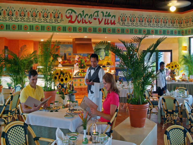 - завтрак, обед и ужин в основном ресторане (шведский стол); завтраки и обеды в итальянском ресторане, закуски в баре на пляже, 3 ужина в неделю в ресторанах a la carte (по предварительному бронированию);