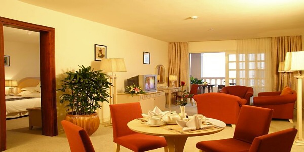 - Junior Suite:расположен на верхних этажах, состоит из спальни с кроватью queen-size или двумя кроватями twin и зоной отдыха, ванной комнаты, балкона с джакузи и великолепным видом на море. Гостям номера предлагаются бесплатные напитки, послеобеденный чай и легкие закуски, поздний выезд (до 15:00) и бесплатное пользование сауной, парной и джакузи в центре Sunrise Spa.