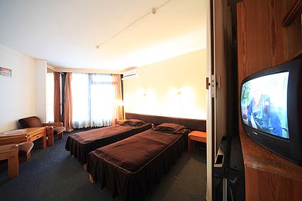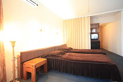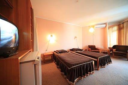- 2-местные двухуровневые номера люкс: туалет, умывальник, душ, телевизор, холодильник, кондиционер, телефон, балкон. Вид на море.