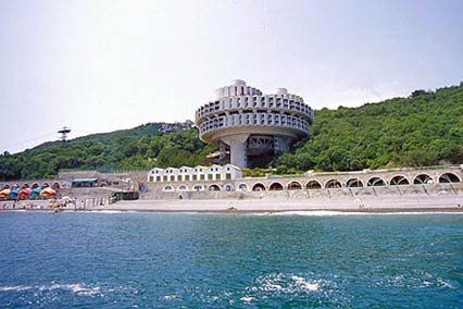 Такое разнообразие проявлений архитектуры вряд ли можно встретить где-нибудь еще и крымский объект эффектно дополняют мозаику странных зданий , поэтому в закономерности попадания здания - здравницы в перечень "странных" сомневаться не приходится, поскольку с моря оно походит на приземлившуюся летающую тарелку и достаточно оригинально решено внутри.
