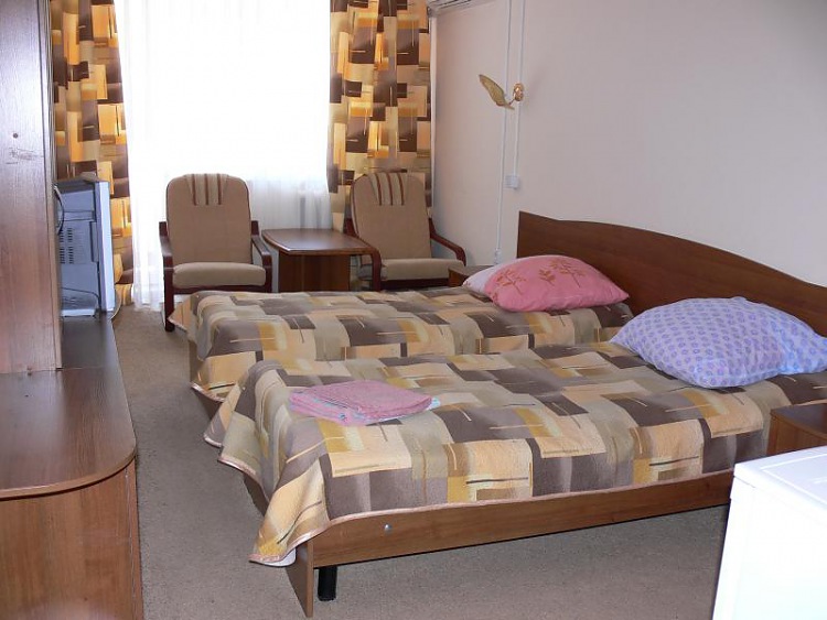 - 2-местный номер «стандарт» (16-18 кв. м). В номере: две раздельные 1-спальные кровати, набор мебели, телевизор (кабельное ТВ, украинские и российские каналы), холодильник, балкон, на полу ковровое покрытие. Санузел совмещенный (туалет, умывальник, ванна).
