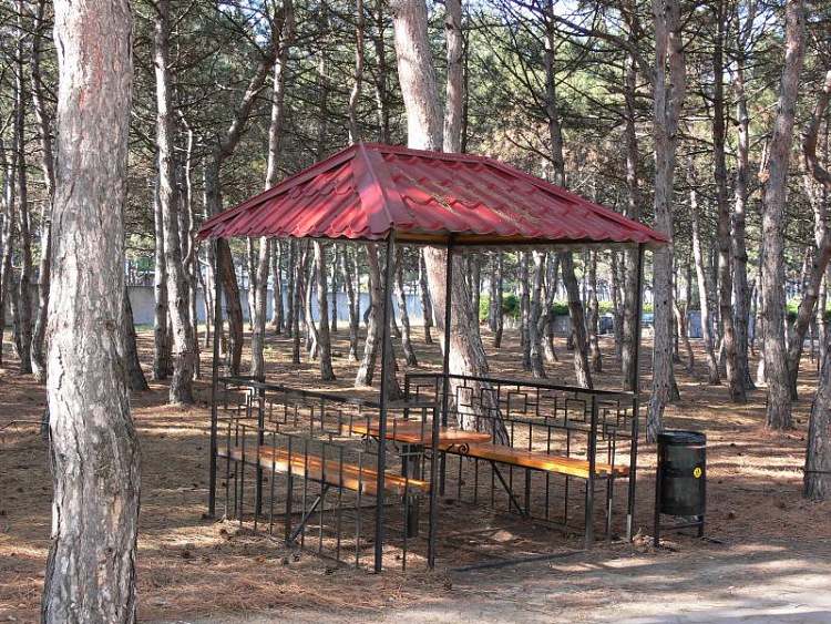 в 70 м от корпуса, мелкогалечный, собственный, оборудованный (навесы «краб», кабинки для переодевания). Пляжные развлечения: банан, скутер (за доп. плату).