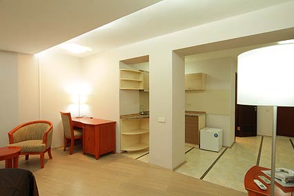 - «Полулюкс» 1-комнатный площадью 35 кв.м - 20. В номере - просторная французская кровать и комфортный диванчик, который можно удобно использовать как спальное место.Мягкое освещение, удобная мебель располагают к непринужденному отдыху. Часть номеров категории «Полулюкс» оборудованы кухонным уголком. Такие номера разделены стеной-перегородкой на спальную зону с двуспальной кроватью и гостевую, где и расположен кухонный уголок. Это полулюксы под номерами 202,205,302,305,402,405,502,505. Оснащение номеров: Плазменная панель; Телефон; Электронный сейф; Кондиционер; Фен; Душевая кабина; Халаты и тапочки; Комплект полотенец; Набор косметики.