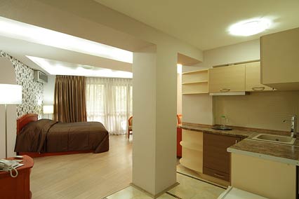 - "Студио+" площадью 35 кв.м - 26 номеров. Есть 1-е и 2-е номера. В однокомнатном номере - спальня с кроватью и диваном. Оснащение номеров: Плазменная панель; Телефон; Электронный сейф; Кондиционер; Фен; Душевая кабина; Халаты и тапочки; Комплект полотенец; Набор косметики.