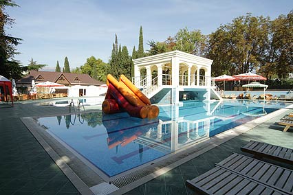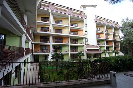 В трех реконструированных шестиэтажных корпусах отеля ранее размещался Международный центр отдыха «Юность». Они утопают в зелени реликтового хвойного парка площадью 4 га, который принадлежит гостинице.