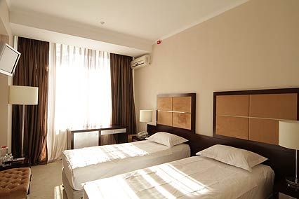 - «Стандарт+» - 8. Создан по проекту номера категории «Стандарт», но увеличен по площади до 28 кв.м. В номере одна широкая французская кровать (категории «double») или две раздельные (категории «twin») и комфортный диванчик. Оснащение номеров: Плазменная панель; Телефон; Электронный сейф; Кондиционер; Фен; Душевая кабина; Халаты и тапочки; Комплект полотенец; Набор косметики.