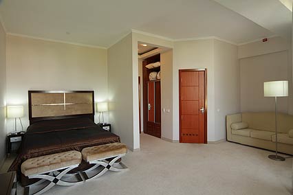 - "Люкс", площадью 52 кв. м - 4. Номер состоит из комфортной спальни с большой французской кроватью и гостиной, в которой есть уютный диванчик, письменный стол, стул. Интерьер гостиной – потрясающий пример сочетания цветов, гармонии линий и форм, которые придают номеру неповторимый колорит. Как в спальне, так и в гостиной есть телевизор. Диван в гостиной можно использовать как спальное место. Оснащение номеров: Плазменная панель; Телефон; Электронный сейф; Кондиционер; Фен; Душевая кабина; Халаты и тапочки; Комплект полотенец; Набор косметики.