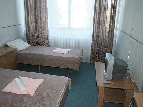 - 1-комнатный 3-хместный номер - (21-23 м кв.) с высокими потолками (3 - 3,5 и кв.), покрытие пола - ковролин. 3 раздельные кровати, шкаф для одежды, 3 прикроватные тумбочки, 3 пуфика, журнальный столик, тумбочка под ТВ, телевизор, холодильник. Санузел совмещенный (2,4 - 3 м кв., пластиковая облицовка): ванна, душ, раковина, унитаз.