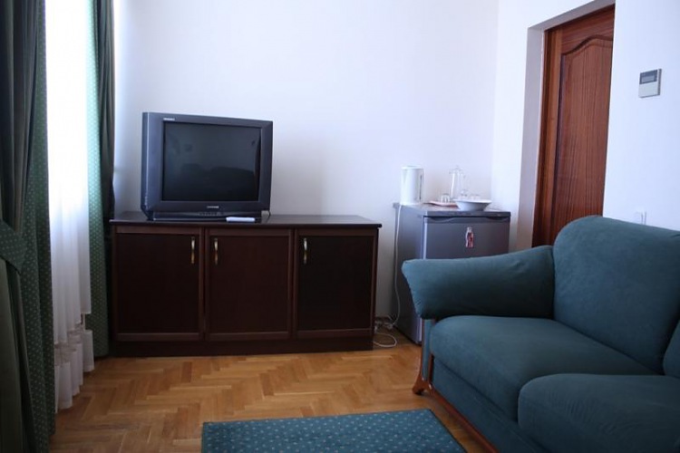 - 2-к 2-местный люкс с КД. Площадь номера - 16 кв.м. В номере: двуспальная кровать, шкаф, стул, письменный стол, фен, + маленькая комната (7,5 кв.м) с раскладным диваном. Без балкона. Всего 6 номеров.
